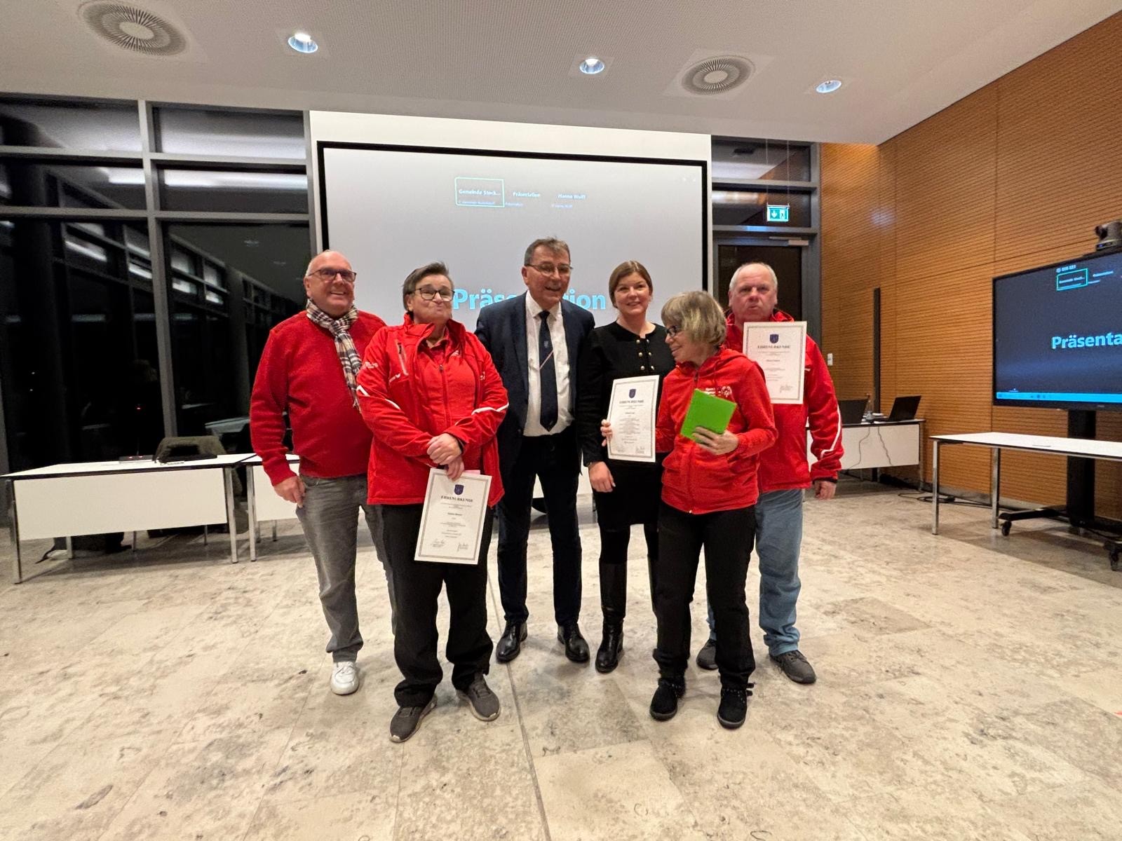 Die Bürgermeisterin, Julia Samtleben und der Bürgervorsteher, Manfred Beckmann überreichten die Ehrenurkunden der Gemeinde Stockelsdorf an die 3 Sportler unserer Inklusionsgruppe "Curauer Löwen", alle aus der Diakonie Nord Nord Ost. Daniela Hanke, Stefanie Lutz und Michael Dikow.